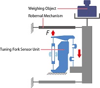 Tuning Fork sensor ─No trouble with high accuracy and fast response time. ─ Vibration frequency changes against the application of load to two piece coupled Tuning Fork. Scale measures this frequency change then convert to the weight value. Stress-strain of the Tuning Fork is 1/10th and its output sensitivity is 50 times of Strain Gauge Sensors | ![]() |